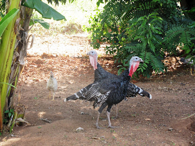 Ao início da tarde fiz uma pausa para o almoço. Saí do hospital pela porta da frente e passei a uma distância próxima mas segura de um dos perus (a fêmea, percebi depois), que estava sozinha e voltada para o outro lado do alpendre. De repente, vi um objeto enorme cair sobre mim e só tive tempo de me desviar do “marido”, que estava empoleirado sobre o telhado da sala de esterilização e fez um voo picado sobre mim quando passei pelo “seu território”. Foi um susto valente e tentei enxotá-lo, naquela confusão de asas e penas esvoaçantes, mas ele estava de tal forma furioso, que achei por bem acelerar o passo e afastar-me rapidamente daquele cenário de bélico, antes que alguém se magoasse! Que bizarria... Um casal de perus ressabiados permanentemente estacionado à porta do hospital… Mas não haveria ninguém que os removesse dali?